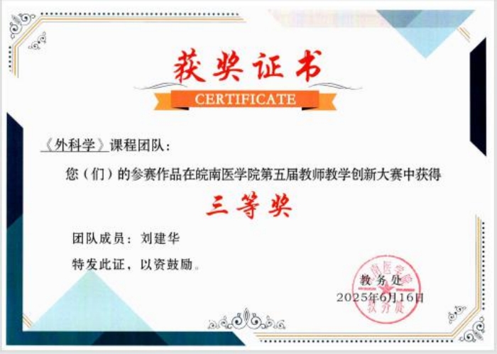 近日,皖南医学院第五届教师教学创新大赛结果揭晓,我院心血管内科李银、重症医学科刘建华两位教师凭借出色表现,在来自全省12家教学医院的25个教学团队中脱颖而出,分获教学副高组一等奖、中级及以下组三等奖的好成绩。