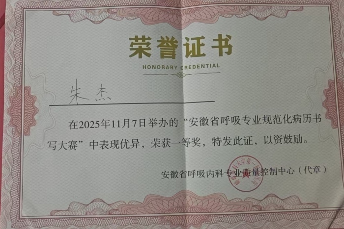 这份荣誉源于朱杰医师的不懈钻研与“医者仁心”的坚守,也离不开呼吸内科团队的支撑。作为安徽省临床重点专科,呼吸内科通过业务学习、疑难病例讨论等多种形式,为青年医师成长搭建平台。未来,呼吸内科将持续强化医疗服务质量、推进人才培养,稳步提升学科诊疗能力,为区域群众健康提供更可靠的保障。(供稿:康恒)