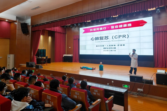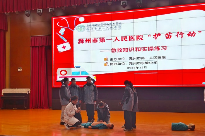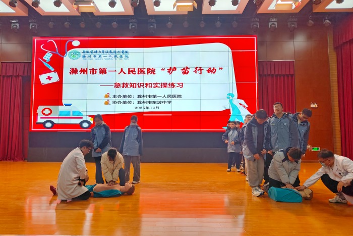 News12月23日下午,我院关工委组织急诊科120救援队医护人员走进滁州市东坡中学,开展“护苗行动”急救知识科普活动。通过理论讲解与实操演练相结合的方式,为同学们送上了一堂生动实用的生命安全课。