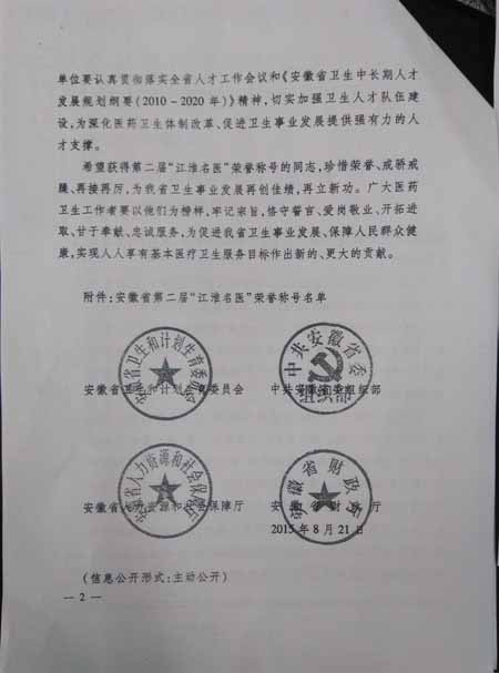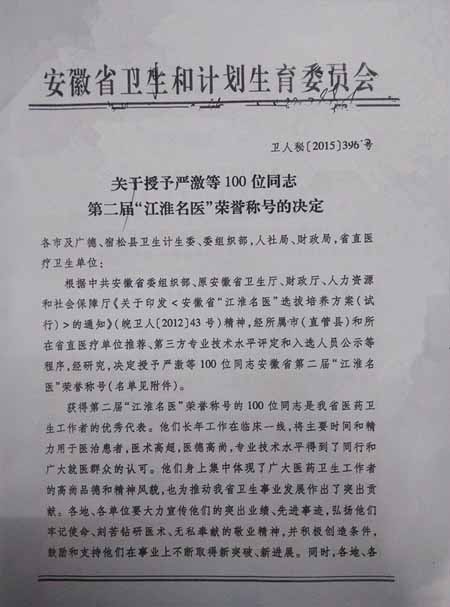 祝贺我院心内科黎敬锋主任和肾内科叶丽萍主任荣获第二届“江淮名医”荣誉称号