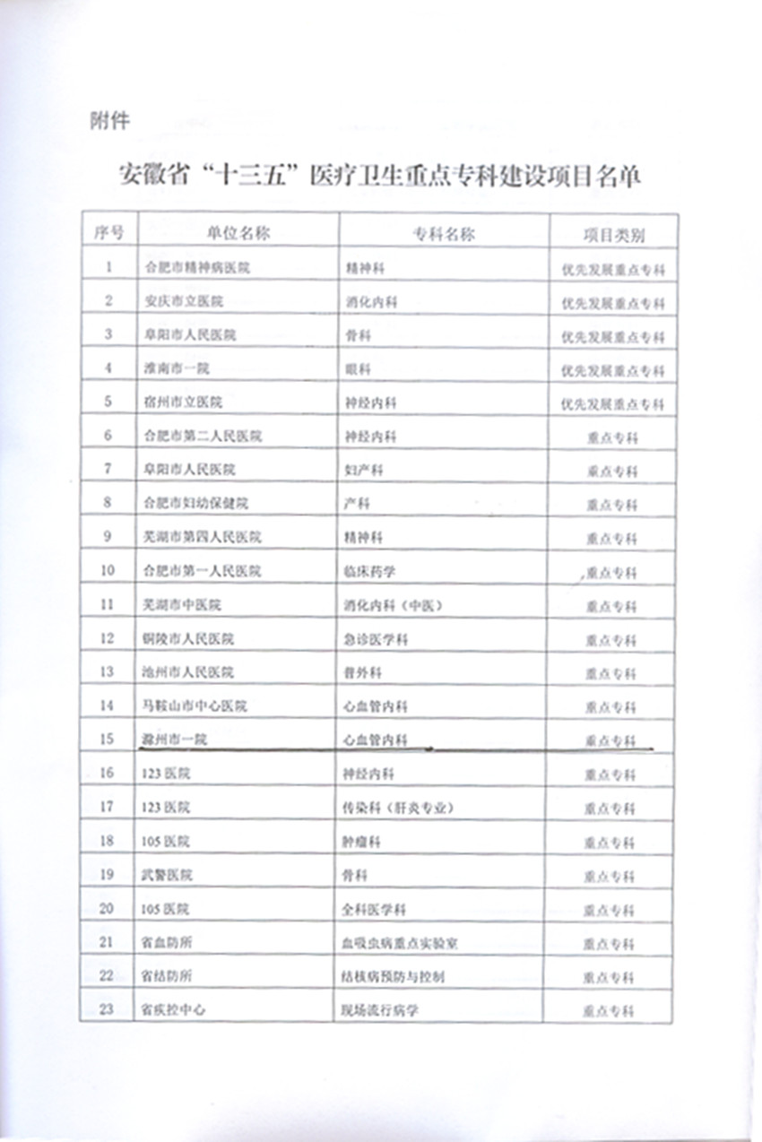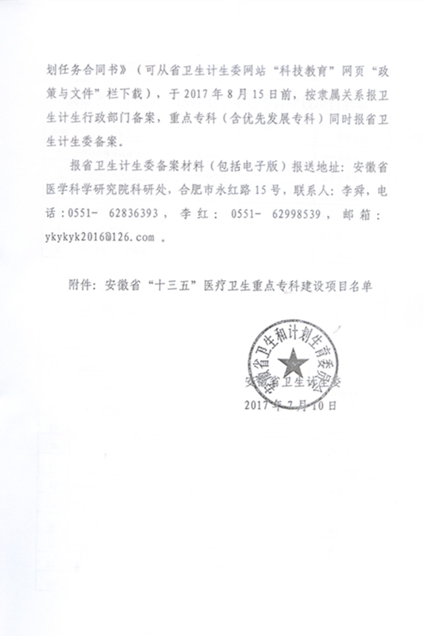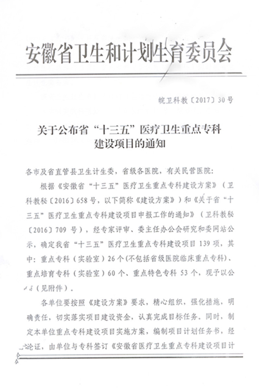 近日,根据皖卫科教〔2017〕30号文件精神,经安徽省卫计委组织专家评审通过,我院心血管内科获安徽省重点专科,神经外科、儿科和神经内科获安徽省特色专科。