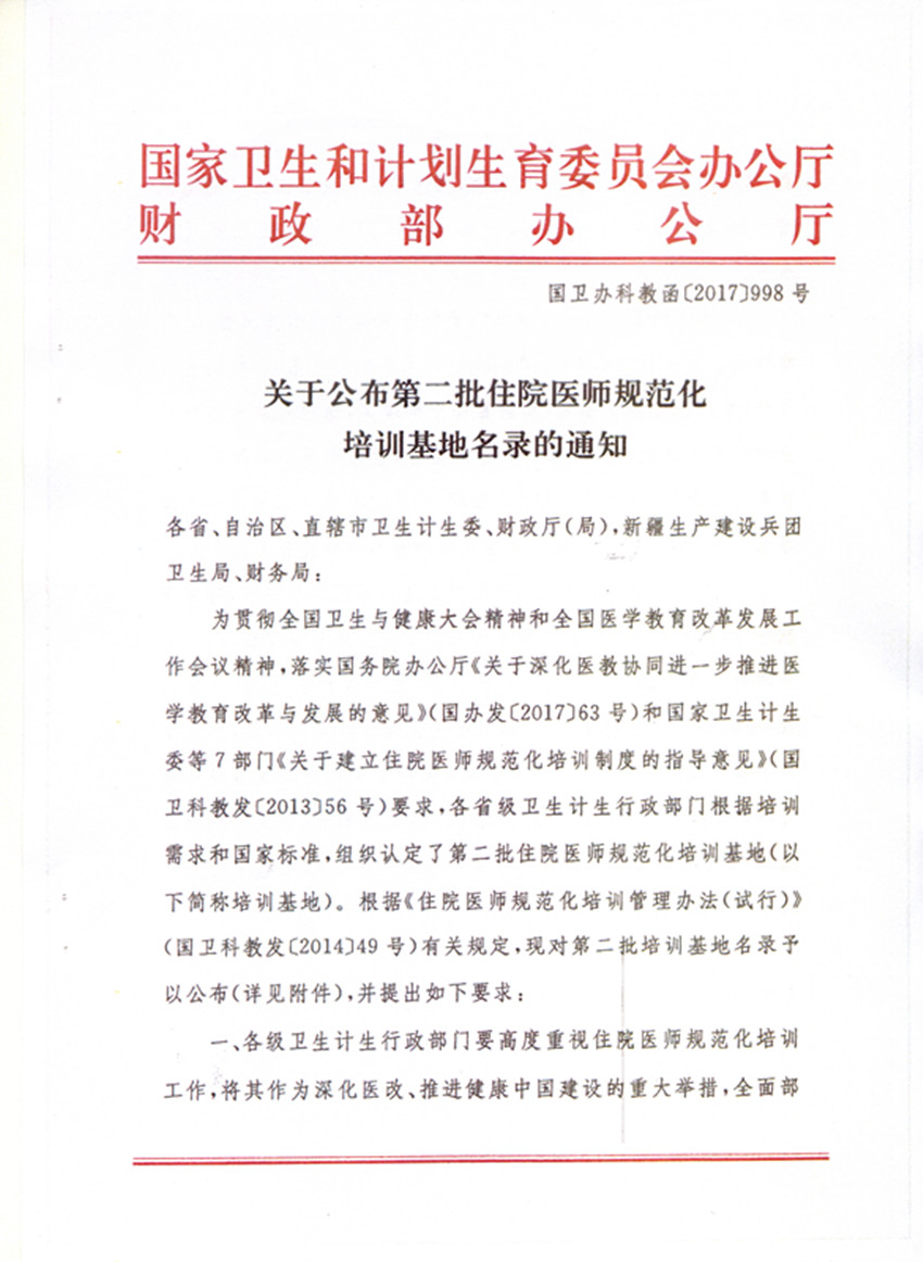 10月12日,第二批住院医师规范化培训基地名录公布,我院正式成为国家住院医师规范化培训基地, 这是在各级领导的关心支持、全院干部职工的共同努力下,今年我院取得的又一硕果。