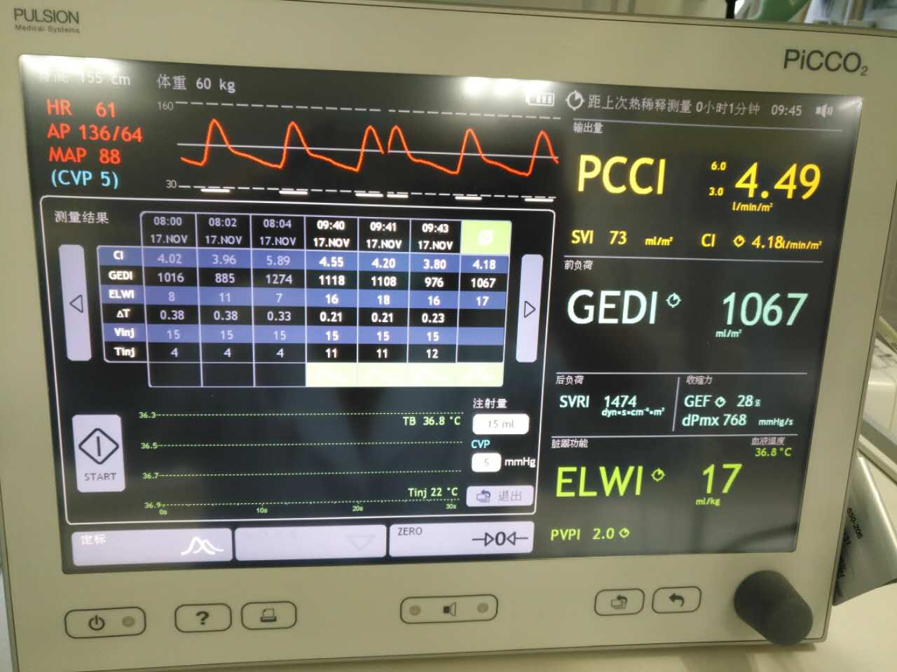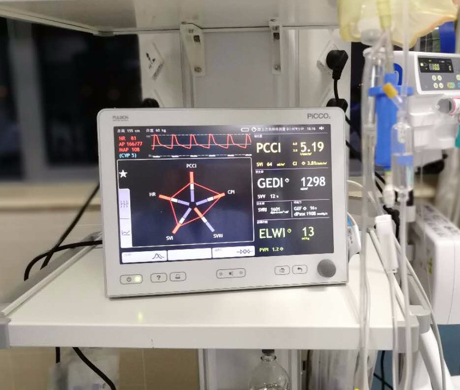 韦正祥主任介绍,“由于准备手术的该患者转入ICU时,血压低,去甲肾上腺素用量很大,已处于休克状态,但休克类型不明确,无法有效确定补液量的增减,这些因素直接导致制定治疗方案十分困难,而PICCO监测技术正好可以解决这个难题。”