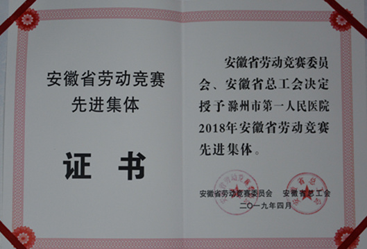 News近日,安徽省总工会公布了《关于表彰2018年度安徽省劳动竞赛先进集体和先进个人的决定》,我院榜上有名,荣获“安徽省劳动竞赛先进集体”荣誉称号,滁州市仅2家单位获此称号,同时,也是全市卫生健康系统唯一一家获奖单位。