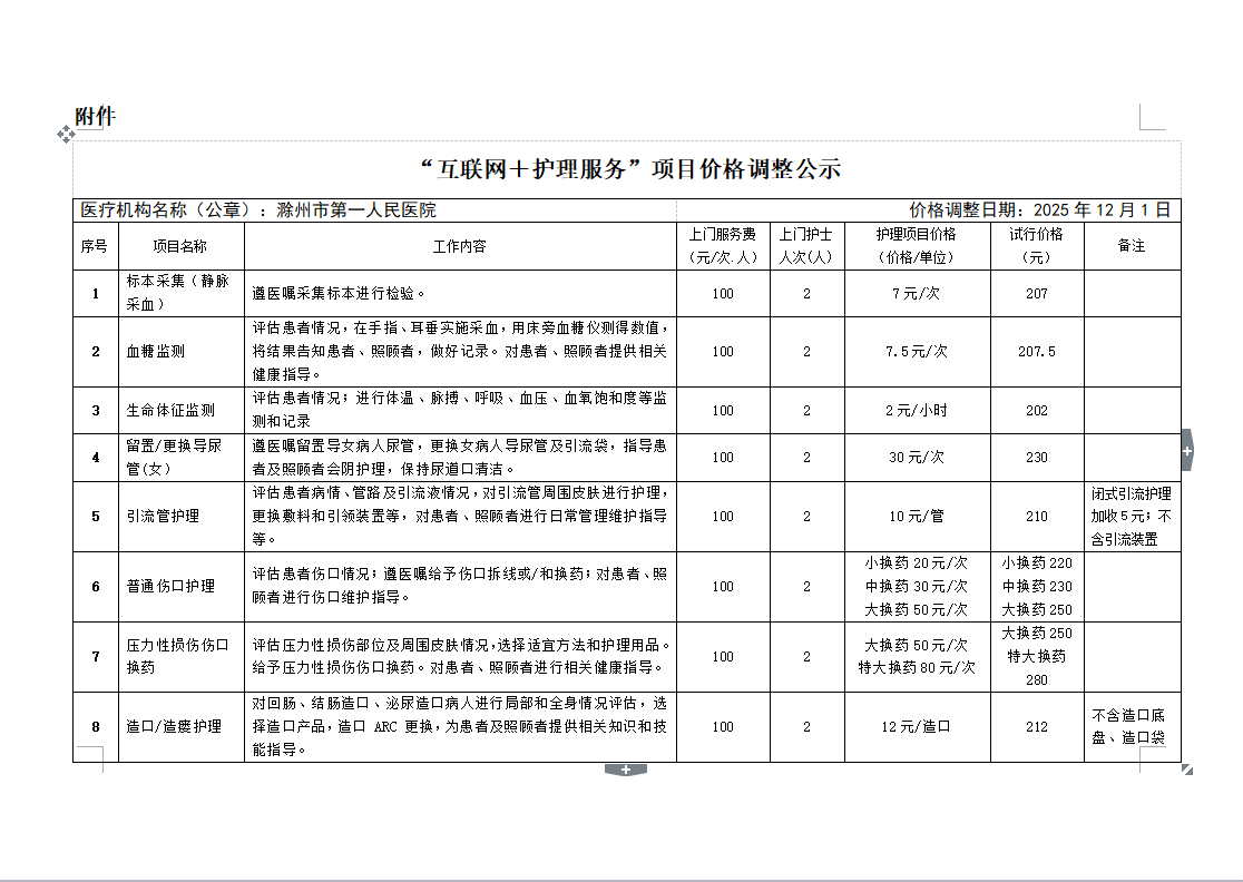 滁州市第一人民医院“互联网+护理服务” 项目价格及内容调整公示