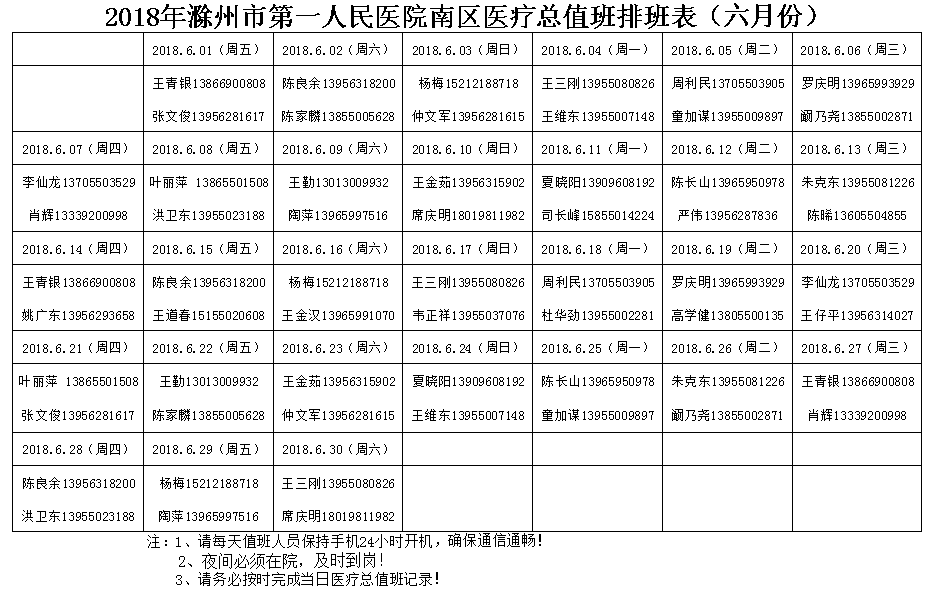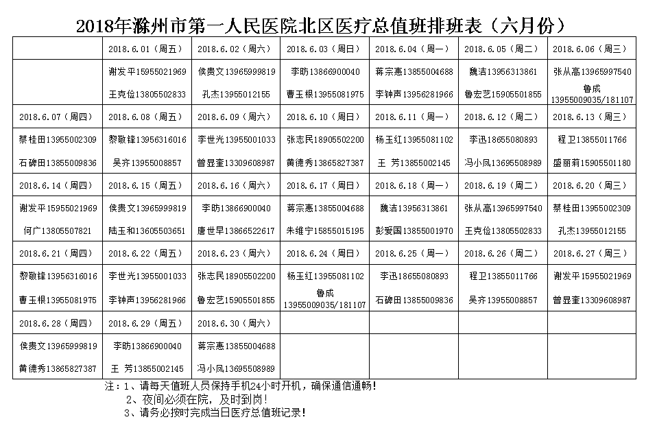 2018年6月份滁州市第一人民医院医疗总值班排班表