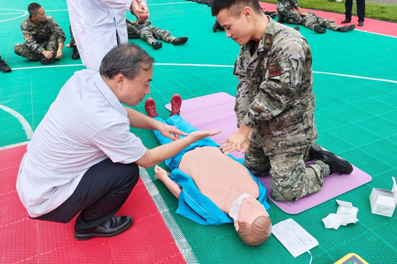 活动现场,专家们为官兵们提供了常见病、多发病的初步筛查与诊疗咨询,耐心解答健康疑问。同时,专家们现场演示了规范的心肺复苏及海姆立克急救法操作流程,并指导官兵们逐一进行实操练习。此次生动的急救技能培训,有效提升了官兵们在紧急情况下的自救互救能力及部队整体应急救护水平。