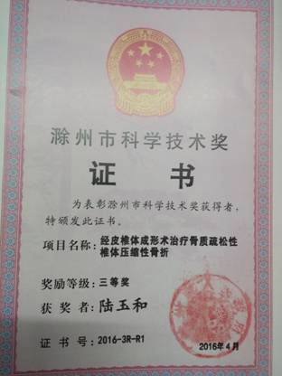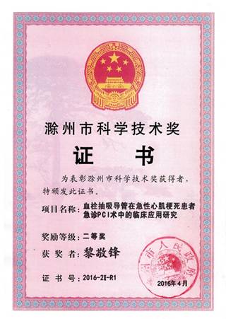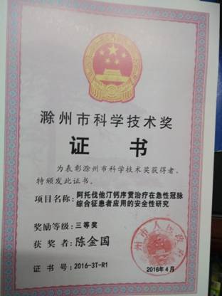 4项获奖成果中,心血管内科四病区黎敬锋主任的“血栓抽吸导管在急性心肌梗死患者急诊PCI术中的临床应用研究”荣获二等奖。陈金国主任医师的“阿托伐他汀钙序贯治疗在急性冠脉综合征患者应用的安全性研究”、肾内科叶丽萍主任的“滁州市慢性肾脏病患病率及相关危险因素调查”、放射科陆玉和主任的“经皮椎体成形术治疗骨质疏松性椎体压缩性骨折”3个成果荣获三等奖,受到滁州市人民政府的表彰。