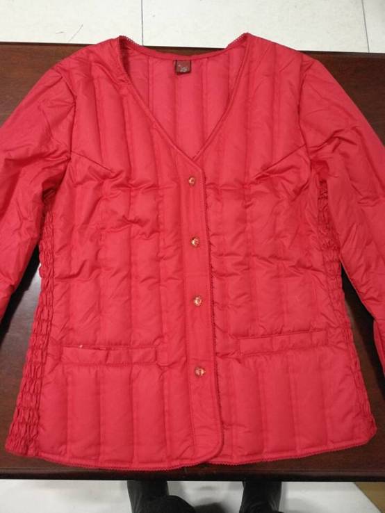 面料100%涤纶,里料100%涤纶,填充物90%鸭绒,蓬松度好,面料柔软舒适亲肤,符合GB-18401-2010-C类标准,面料颜色女式红色或玫红色,男式藏青色。