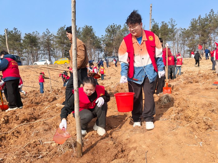 活动现场暖意融融、秩序井然。在工作人员指导下,团员青年们迅速投入劳动,大家分工明确、协作默契,挥锹挖坑、扶苗正株、培土压实、浇水灌溉,每一个环节都一丝不苟。大家不怕脏累、干劲十足,用双手将树苗植入土壤,用汗水浇灌新生绿意。经过一上午的辛勤劳作,一排排新栽树苗迎风挺立,为舜山林场增添了勃勃生机,也为滁州生态建设注入了青春动能。