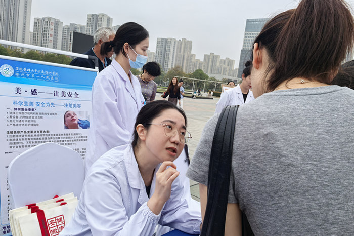 10月11日下午,我院5名医务人员参加了由安徽省卫健委、安徽日报报业集团主办,安徽省卫健宣传教育中心、安徽商报和滁州市卫健委承办的“科学减重 快乐生活 —— 体重管理年”以及“医美安全行”健康社区行活动。活动在滁州市初心广场举办,为滁州市民带来了一场集健康咨询、专业诊疗、安全科普于一体的“健康盛宴”。